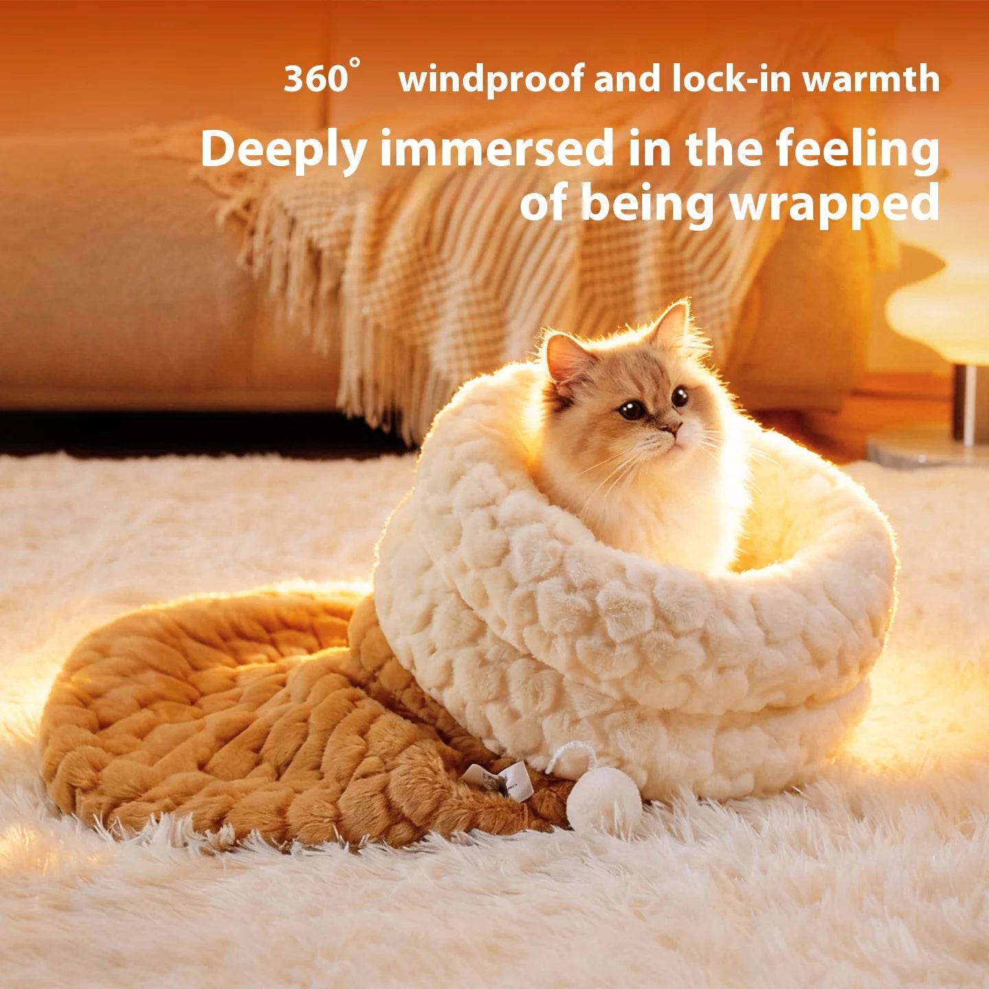 Keep your cat warm and cozy with this enclosed plush cat bed. Features a tunnel entrance and self-warming rabbit fur lining, providing a secure and comfortable hideout—perfect for winter and indoor pets.